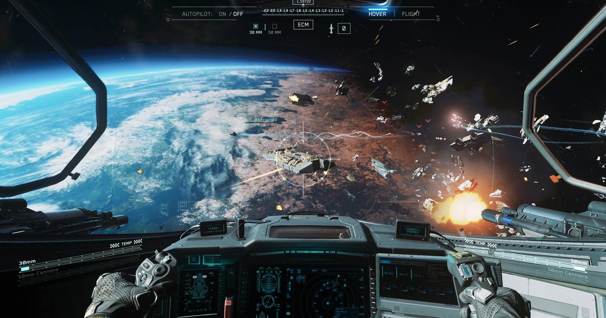 Wakeford also cites the game's battleship hub, which is very much the bit of Infinite Warfare I remember most fondly, or at least, the part I found most intriguing when I reviewed it myself. The game is woven around a slick feedback loop of launching you out in your starfighter to a mission zone, and returning you to the hangar at the end for a walk-and-talk about current events. It's sort of like a really trimmed-down Mass Effect. The sinuous, high tech staging of the hub-mission alternation is also quite sinister in that you end up feeling like just another piece of ordnance, fed through a huge, unstoppable war machine.